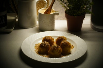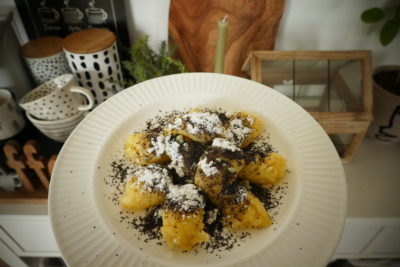 Jablečné knedlíky ze strouhaných jablek a hrubé mouky. Posypané cukrem, skořicí, oříšky a zalité máslem.