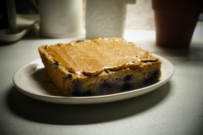 Snídaně. Zapečená ovesná kaše s borůvkama a arašídovým máslem.